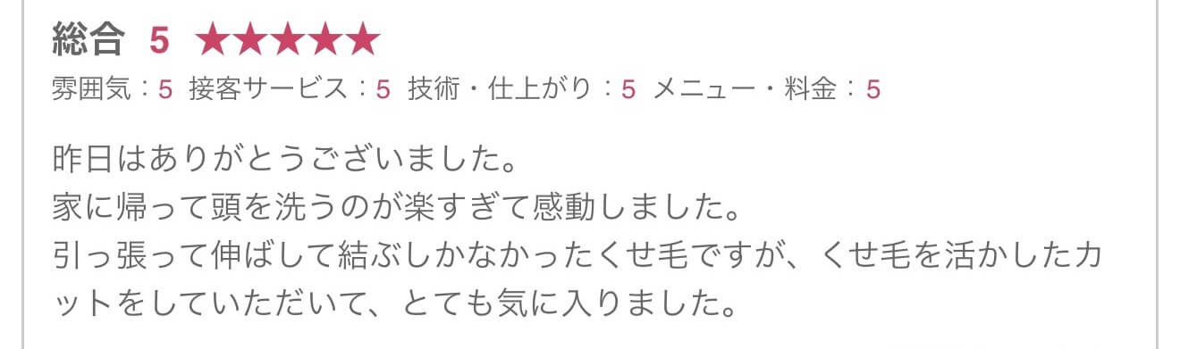 引っ張って伸ばして結ばしかなかったくせ毛ですが、くせ毛を活かすカットをしていただいて、とても気に入りました。