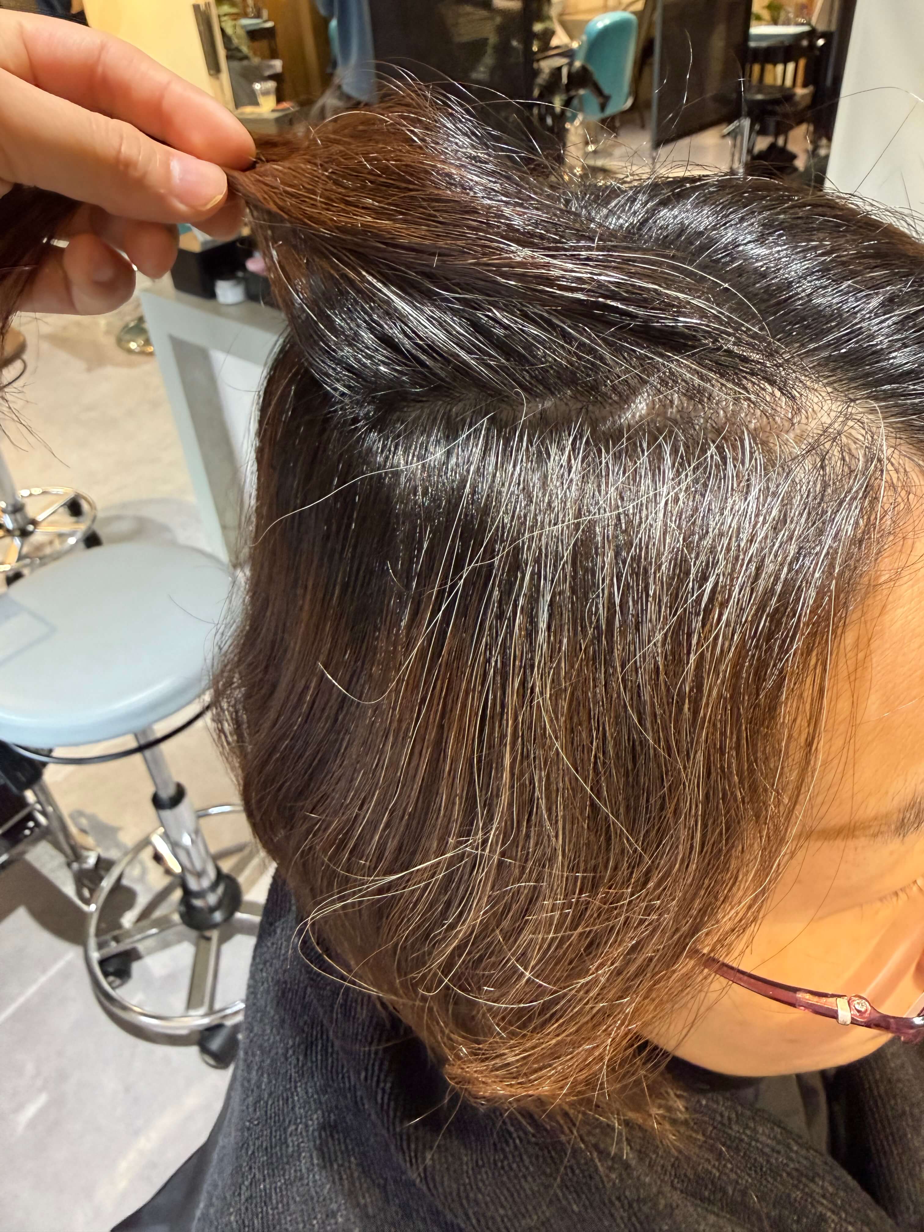 白髪がまばらにある分、自然なハイライトっぽい見え方になるので、それを活かした配合にしました。