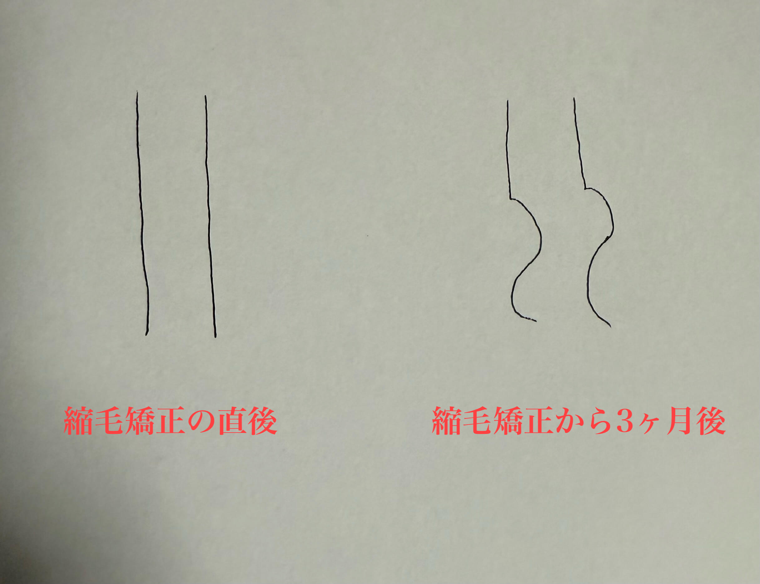 例えば上の写真みたいに縮毛矯正の直後は真っ直ぐでも、3ヶ月したらくせ毛が出てきますよね。