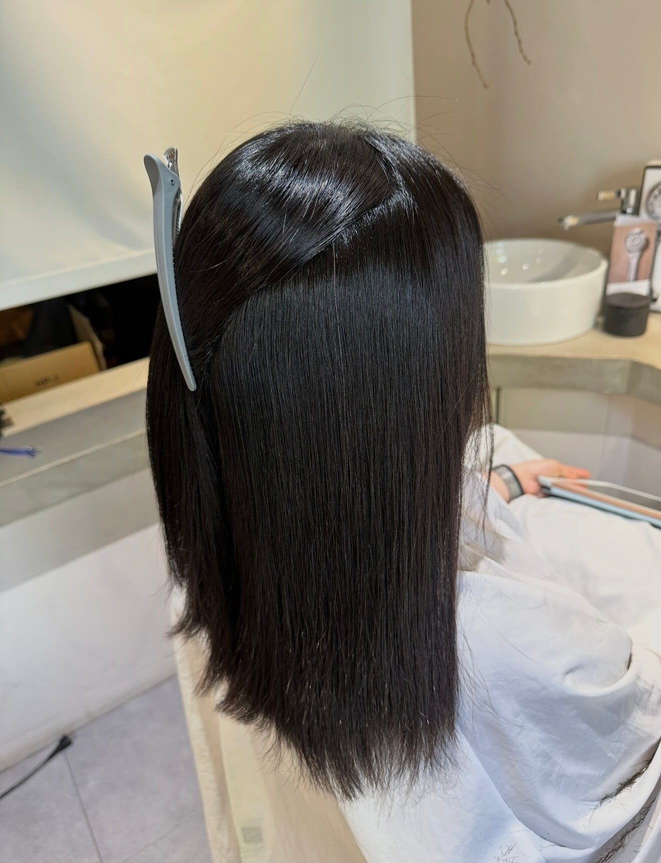 このお客様は普段は下ろして過ごすことが多く、巻くこともあるのでくせは伸ばすけど、真っ直ぐにしすぎないように柔らかい質感を意識しました。